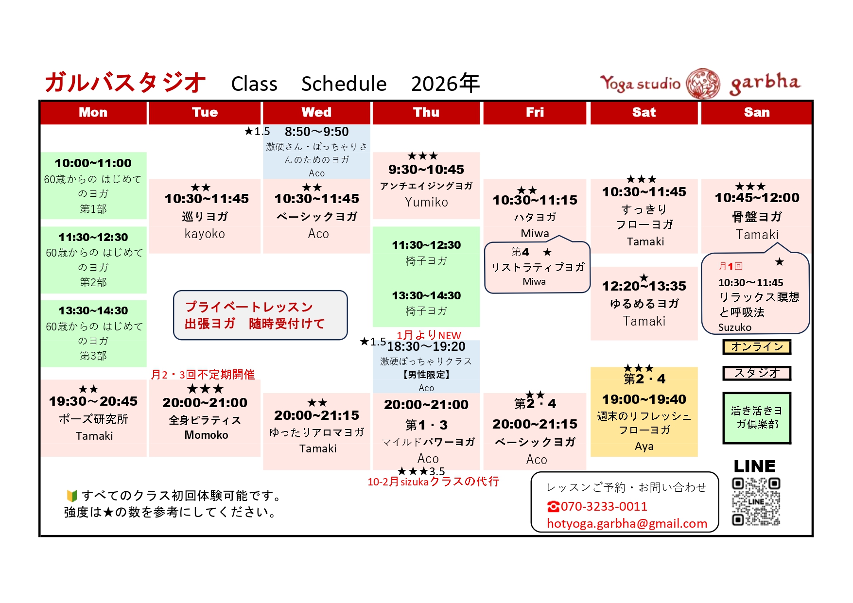 ※スケジュール・クラス数は変更になる可能性があります。毎月のスケジュールは、お知らせからご確認ください。