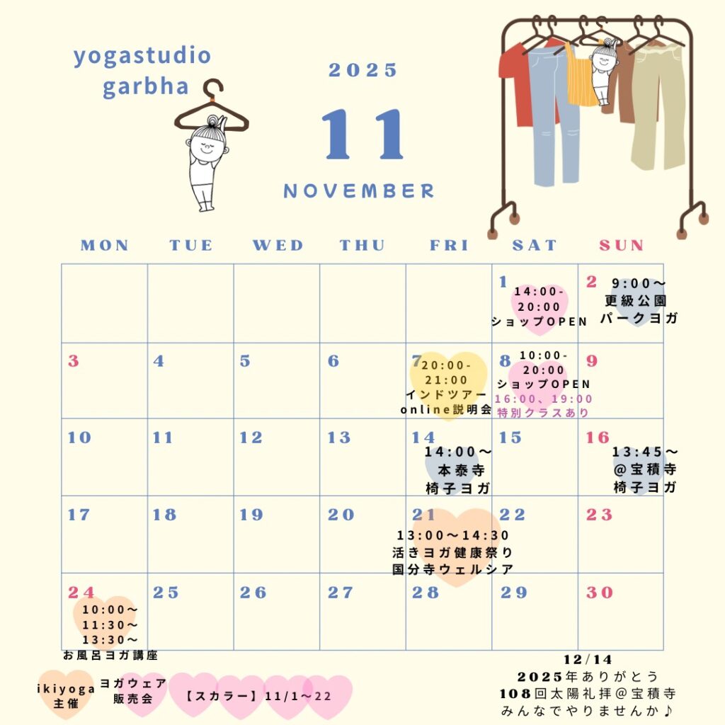 11月はヨガウェア販売会を予定しております。普段着にも使えるかわいいウェアが揃いますので、お楽しみに♪
