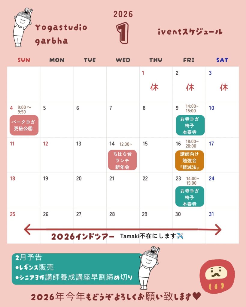 ・1月16日(木)『インストラクター勉強会』Chiaki・Aco 18:00~20:00・・・ヨガインストラクターのための勉強会を開催します。今回のテーマは”軽減法”。