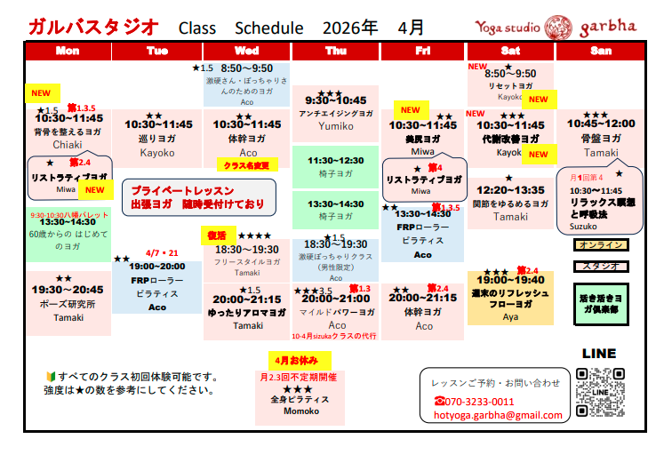 ※スケジュール・クラス数は変更になる可能性があります。毎月のスケジュールは、お知らせからご確認ください。